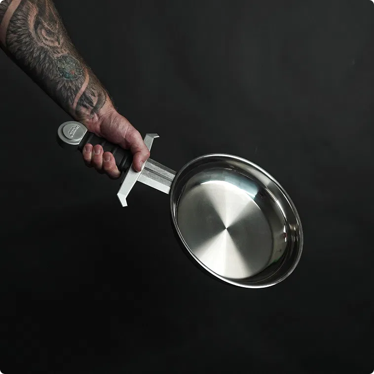 Experience culinary mastery with Eggscalibur ™, the first of its kind sword handle frying pan.
